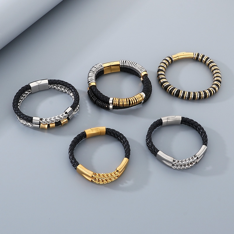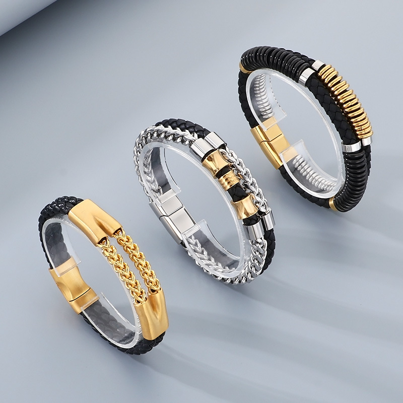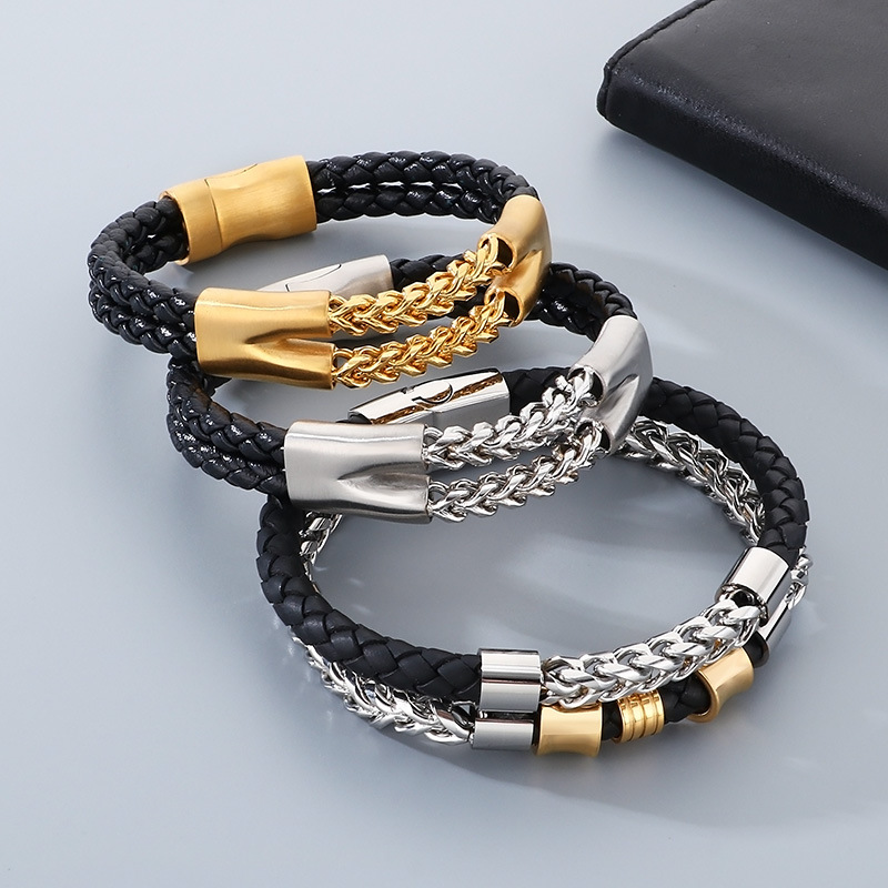 A bold balance of braided leather and polished metal. Built to feel solid on the wrist, understated but confident.